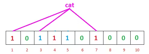 So, when searching for the cat, our hash functions are giving us 1, 3, and 7 this time. And we can see that all of the indexes are already marked as one. That means we can say, “Maybe the cat is already inserted on our list.”