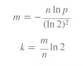 Don’t worry, we mostly need to decide what our m and k will be. So, if we set an error tolerance value, p, and the number of elements, n, by ourselves we can use the following formulas to calculate these parameters: